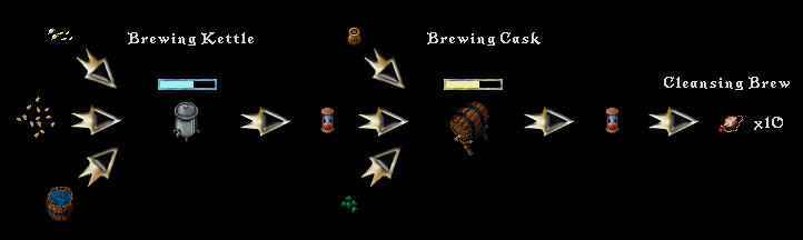 Players can undertake a Brewing process to create consumable items. Currently, Brewing is limited to Cleansing Brew (x10), but it will later be expanded to include additional craftable items. The brewing process involves growing Hops and Barley, using a Brewing Kettle, and transferring the mixture to a Brewing Cask before collecting the final product.