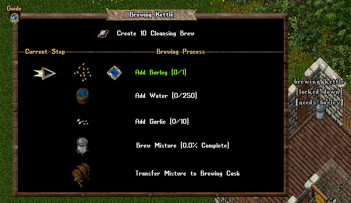 Players will need access to a Brewing Kettle, which can be crafted using the Blacksmithy skill. The Brewing Kettle must be locked down in a house to be used. Double-clicking a Brewing Kettle opens the Brewing Kettle Menu, where players can see the current recipe being worked on. At present, the only available recipe is for 10 Cleansing Brews, but additional recipes will be introduced in future updates.