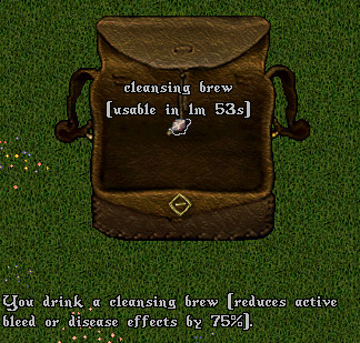 Cleansing Brew is consumed by double-clicking it. When used, it reduces all Bleed and Disease effects on the player by 75%. There is a 2-minute cooldown between uses to prevent excessive consumption.