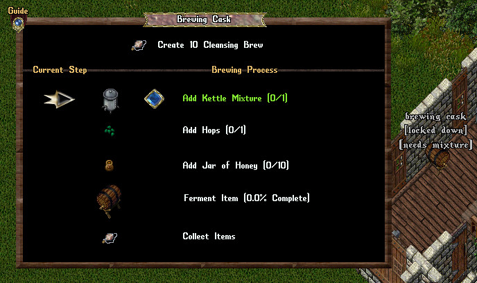 The menu also displays the remaining steps in the recipe. If the current step requires player interaction, a Blue Button will appear, which when clicked, allows the player to take the necessary action—typically adding an ingredient from their backpack. When the player reaches the step "Transfer Mixture to Brewing Cask," they must have a Brewing Cask locked down within 4 tiles of the Brewing Kettle.