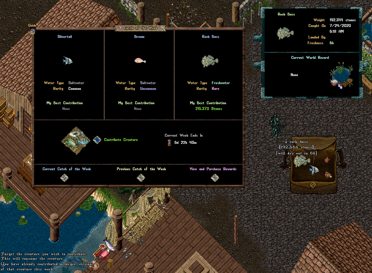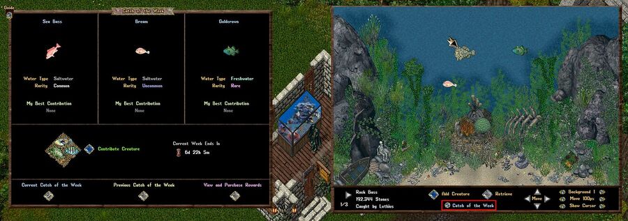 Catch of the Week is a competitive fishing event where players aim to catch and contribute the largest creatures for three randomly chosen Aquarium Creature types each week. The event resets on a weekly cycle, aligning with the Society Jobs reset every Friday night. Each week, one Freshwater and two Saltwater Aquarium Creatures are selected, ensuring that at least one is a Common creature, one is Uncommon, and one is Rare.