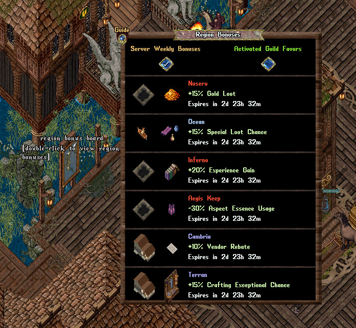 The Region Bonus Board is available at all town banks. Double-click the board to view the Server Weekly Bonuses and any activated Guild Favors.