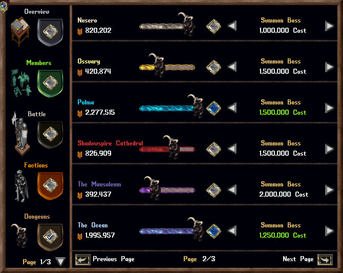 Bosses can be summoned using the [dungeons menu. In order to summon a dungeon's boss, a guild must collectively farm up the required amount of gold within that dungeon. This begins at 1 million gold farmed for a main boss, and 500,000 gold farmed for a mini-boss. Each time a guild summons a particular dungeon's boss for the week, the cost of summoning this boss increases. The cost of a main boss increases by 500,000 gold farmed per summon, and the cost of a mini-boss increases by 250,000 per summon. This resets each week at the Friday weekly reset.