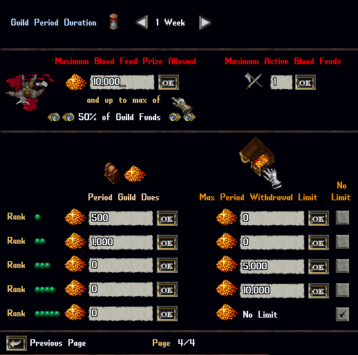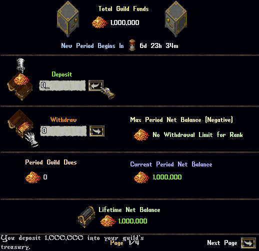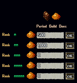 Guildmasters can assign Guild Dues for each rank, ensuring that members contribute financially to the guild every Pay Period. Additionally, a Maximum Period Withdrawal Limit can be set to control how much gold a member can take from the treasury.