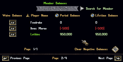 Guild officers and guildmasters can waive a member’s negative balance by clicking "Waive Balance" next to their name. If a guild has multiple members with negative balances, the "Clear Negative Balances" button allows for a bulk reset.