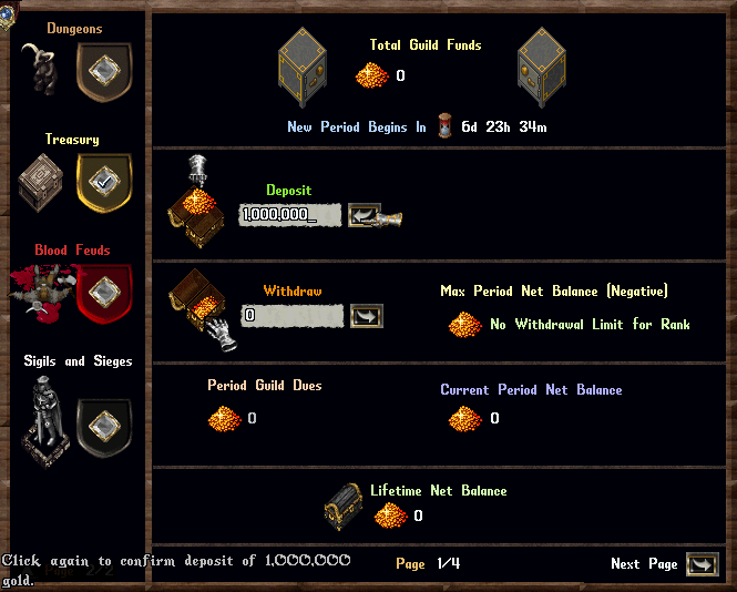 Guilds have access to a Treasury that allows them to store gold, assign guild dues, manage withdrawal limits for members, track financial transactions, and facilitate Blood Feud management. Guild members can access the Guild Treasury from the Treasury Tab on the second page of the Guild Menu.
