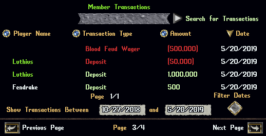 The Member Transactions Page logs all deposits, withdrawals, and treasury transactions related to Blood Feuds. Members can search by player name or filter transactions by type, amount, or date range.