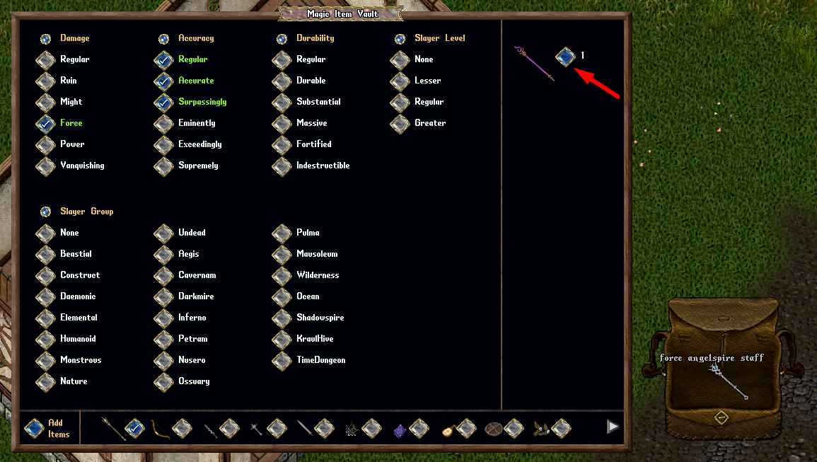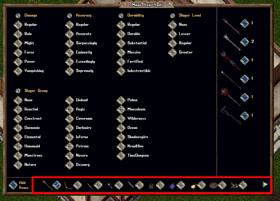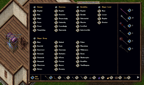 Players can store any Identified, Fully Repaired Magical Item in the Magic Item Vault, including Weapons, Spellbooks, Instruments, Armor, and Shields. Items can be manually added by clicking the "Add Items" button, which will provide the player with a targeting cursor to select one or more items. For faster storage, players can shift-click the Magic Item Vault and select the "Add All in Backpack" context menu entry to automatically transfer all valid items from their backpack to the vault.