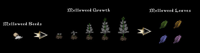When a Melloweed plant reaches full growth, harvesting it will yield Melloweed Leaves, which will retain the same hue as the fully grown plant. Players can also single-click Melloweed Leaves to view their specific hue.