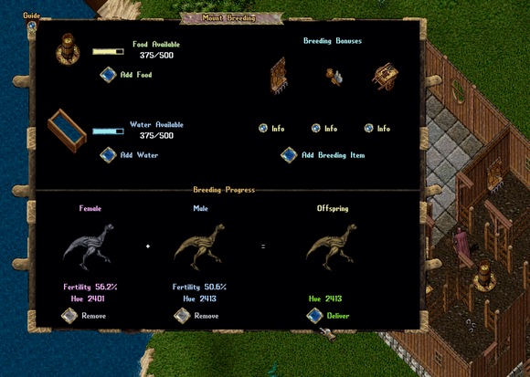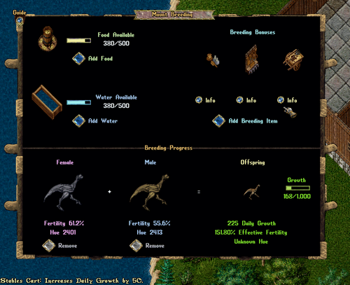 To breed mounts, players must have a Feeding Trough (craftable via Carpentry) that is locked down inside their house. Double-clicking a locked-down Feeding Trough will open the Mount Breeding menu. Players must add both a Male and Female creature of the same species to the Feeding Trough by clicking the Add button under each gender and targeting the respective creature. Adding a creature stores it inside the Trough, and players may remove a creature at any time by clicking the Remove button (removing a creature in the middle of breeding will abort the process).