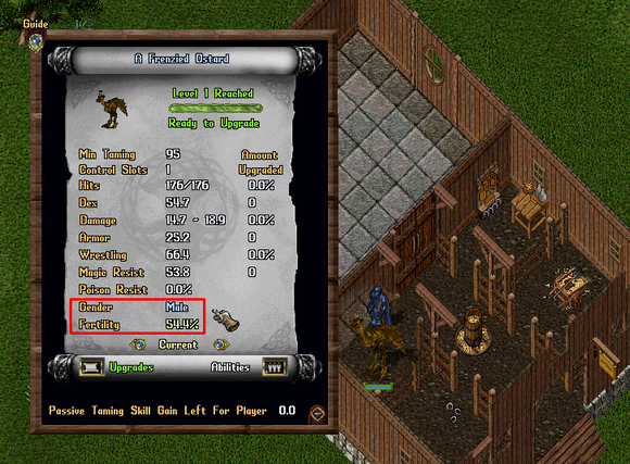 Players can now breed Horses, Llamas, Desert Ostards, Forest Ostards, and Frenzied Ostards, with additional creatures potentially available in the future. Breeding allows players to create offspring with special and potentially rare hues. Each breedable creature is randomly assigned a Gender and a Fertility Rating (ranging from 0% to 100%), which can be viewed in the Animal Lore window. Only Bonded (Level 1) creatures are eligible for breeding, and creatures with a Fertility Rating of 0% cannot be used. Players can reduce a breedable mount's fertility to 0% using Sterilization Tablets, which can be crafted with Cooking.