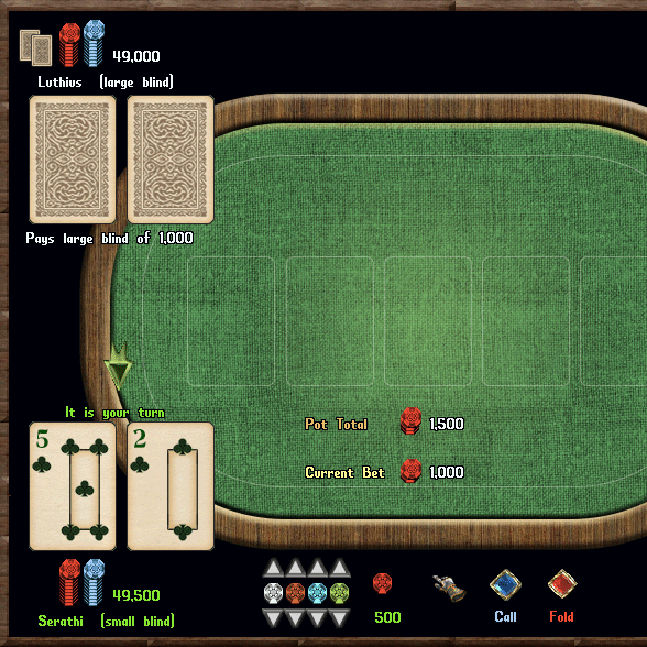 When it is a player’s turn, a bell sound plays, and the action menu appears. The game automatically sets the player’s initial bet to match the current call amount. Players can increase or decrease their bet using the Up and Down arrows next to each chip type. Clicking the Blue button places the bet, with its text changing dynamically between Check, Call, or Raise. Players who wish to fold can do so immediately by clicking Fold.