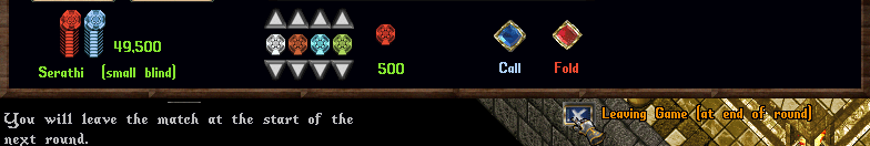 The maximum buy-in for poker is 10,000,000 gold. Players who reach 0 gold during a Public Cash-Game match will be automatically removed unless they re-buy within 2 minutes. Leaving or being auto-kicked from a match results in a 10-minute lockout from rejoining. Players also have the option to enable Auto-Call, Auto-Check, and Auto-Fold during rounds for convenience. In Sit-And-Go games, the blinds will increase for every five hands that reach a showdown.
