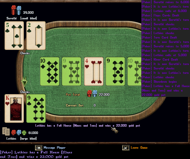 At the end of a round, the winning hand's relevant cards will be highlighted in green. If a player leaves the game or the match ends, any winnings above their initial buy-in will be subject to a 10% rake deducted by the house.