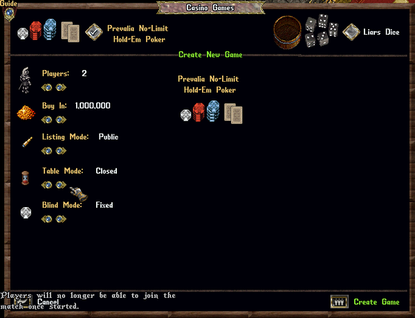Players can create a game by clicking the Create Game button in the menu (whether accessed via the Casino Dealer or a House Table). Various settings such as Listing Mode, Table Mode, and Blind Mode can be adjusted before the game begins. Listing Mode determines who can see the game in the Available Games list. Table Mode decides whether new players can join a match if someone leaves or is eliminated, with Open allowing new players and Closed restricting entry. Blind Mode affects how blinds increase—Fixed Blinds remain unchanged, while Progressive Blinds increase as the number of players at the table decreases. To use Progressive Blinds, players must set the table mode to Closed.