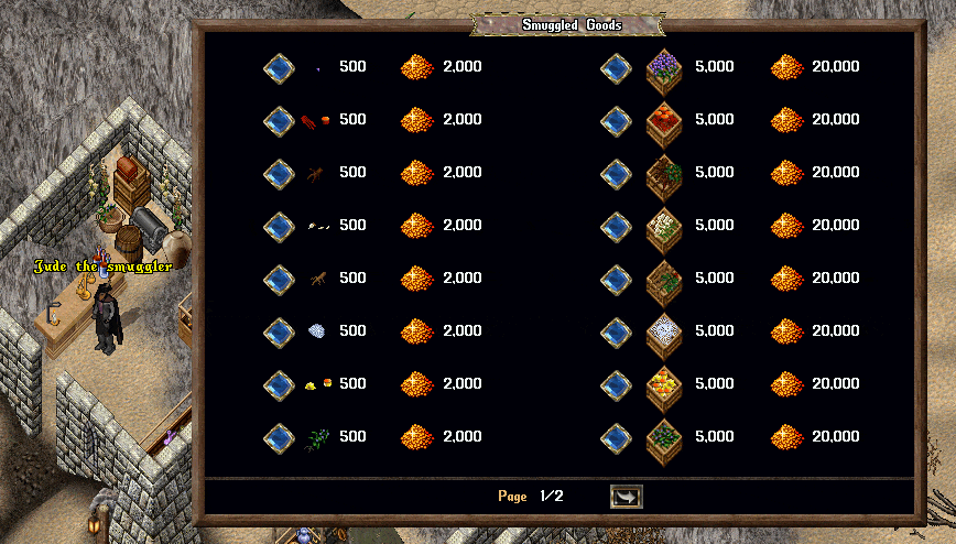 The cost of items from a Smuggler NPC is 25% to 33% higher than prices at town vendors. This price increase reflects the nature of dealing with illicit traders and the convenience of purchasing without restrictions. Gold for purchases is automatically withdrawn from the player’s Bank Box, while the purchased items are placed directly into the player's backpack.