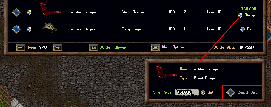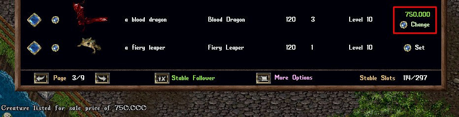 Players can adjust their Sale Price or remove the creature from sale at any time by clicking the "Change" button, which reopens the Pricing Window. Canceling the sale or setting the price to 0 Gold will remove the creature from sale.