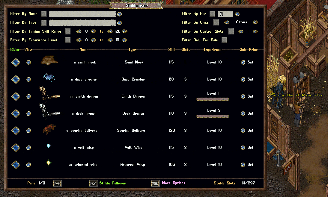 The Stablemaster Menu provides a variety of filtering options for players to manage their stabled creatures efficiently. Additionally, players now have the ability to sell their creatures directly through the menu.