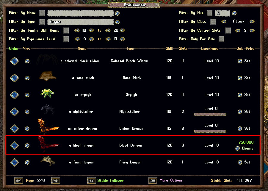 Once a creature is listed for sale, its price will be displayed in Green Text within the Stablemaster Menu.