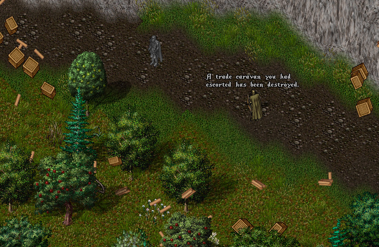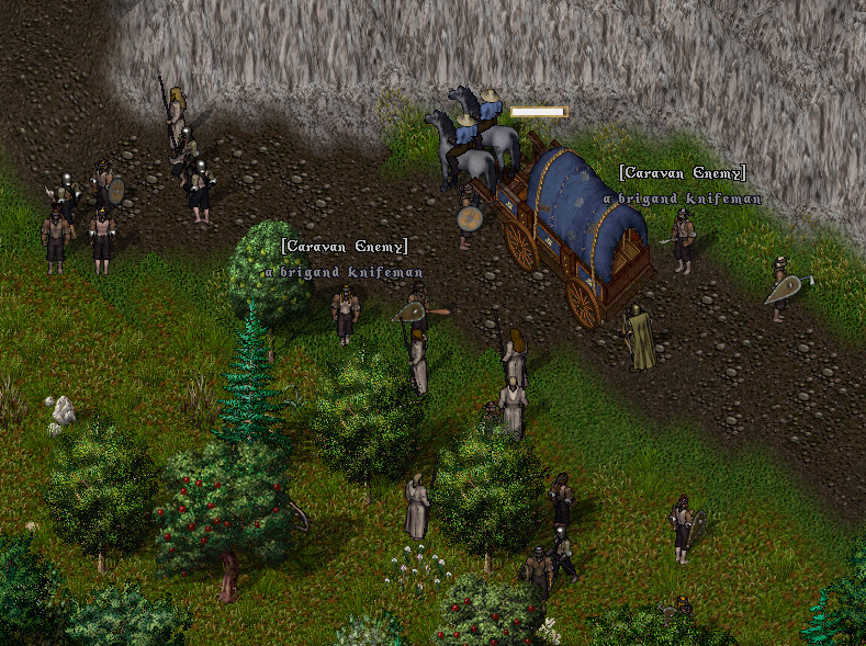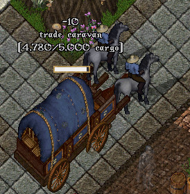 Trade Caravans can also be attacked by other players. Any non-friendly player can attack a caravan, provided it is currently stopped. To initiate an attack, a hostile player can either double-click the caravan’s health bar or shift-click any of its NPC horsemen and select Attack.