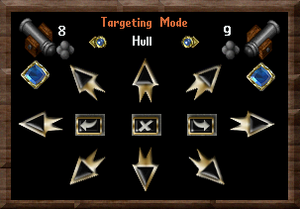 - Small arrows cycle through Cannon Targeting Modes (Hull, Sails, Guns, Crew, Accuracy). Firing sets the selected mode.