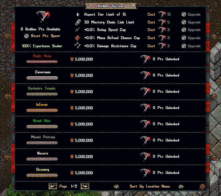 The Redline System allows high-end players to continue progressing their Aspect Tiers, Mastery Chains, and Stat Caps beyond normal limits. Players earn Experience and unlock Redline Points, which they can spend on various Redline Upgrades. All experience and Redline Points are shared account-wide, meaning any character on the same account benefits from them.