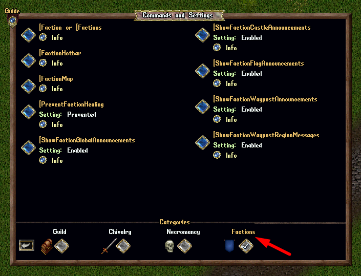 The Commands and Settings menu has a number of Faction-specific toggleable options and hotkeys for players, that can be accessed by using Paperdoll -> Help -> Commands -> Faction