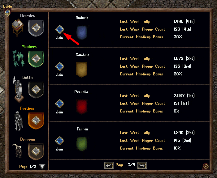 - Guilds can leave a Faction by clicking the Leave button next to their Faction on page 3 of the Factions Menu