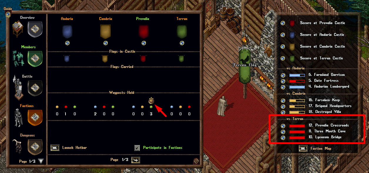 - If a Guild has aligned themselves with a Faction, each individual player in that guild who wants to participate in Faction activity MUST have "Participate in Factions" enabled on the page 1 of the Faction Menu