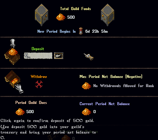 - Players can type a gold amount into the text field below "Deposit" and click the Arrow key nearby to place gold from their bank into the guild's Treasury