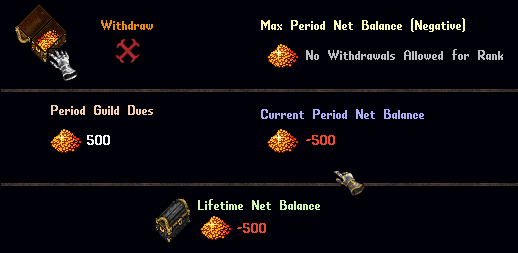 - It is recommended that guild ranks either have a Period Guild Dues set or a Max Period Withdrawal Limit set, but not both (since Guild Dues are automatically added to a player's Pay Period Net Balance)