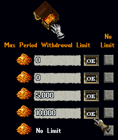 - If a guildmaster wishes for a guild rank to have No Limit on how much gold they can withdraw each Pay Period (meaning they could effectively empty the treasury) they should click the Checkbox underneath "No Limit"